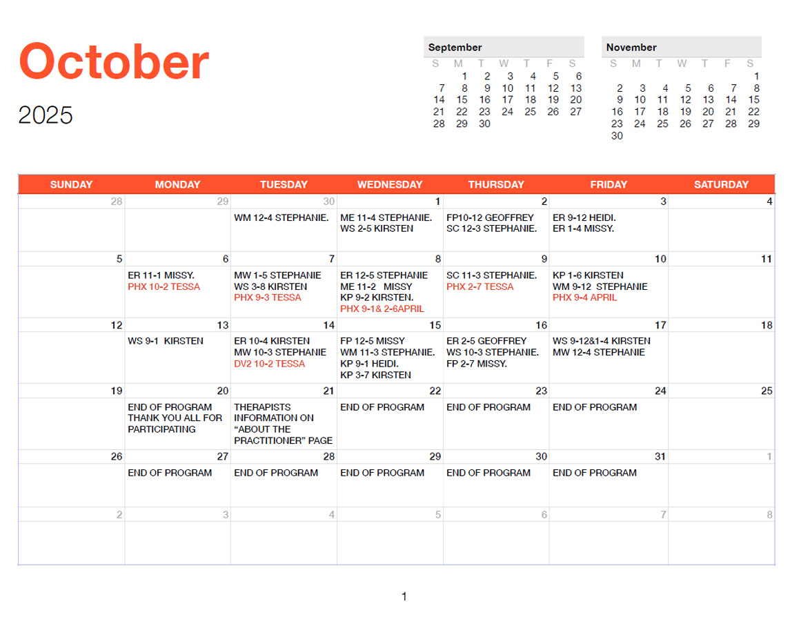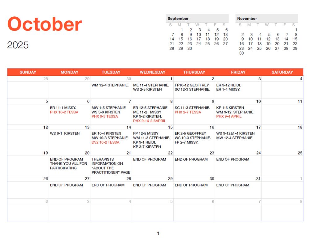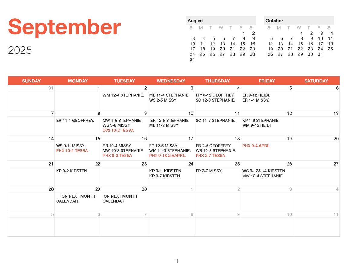 Shift schedules will repeat every fourth week which will comply with getting a massage once a month. The top of the home page will have the two calendars showing all the shifts.